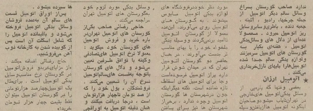 نقطه پایان خودورهای فرسوده در تهران موضوع این گزارش است. روزنامه اطلاعات ۴ دی ۱۳۵۴ گزارش میدانی خبرنگاری را منتشر کرده که راهی گورستان خودروها شده است. گزارش را بخوانید.