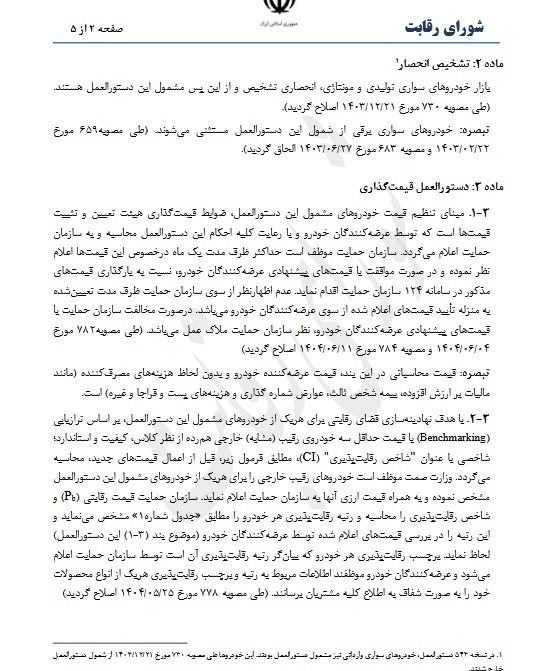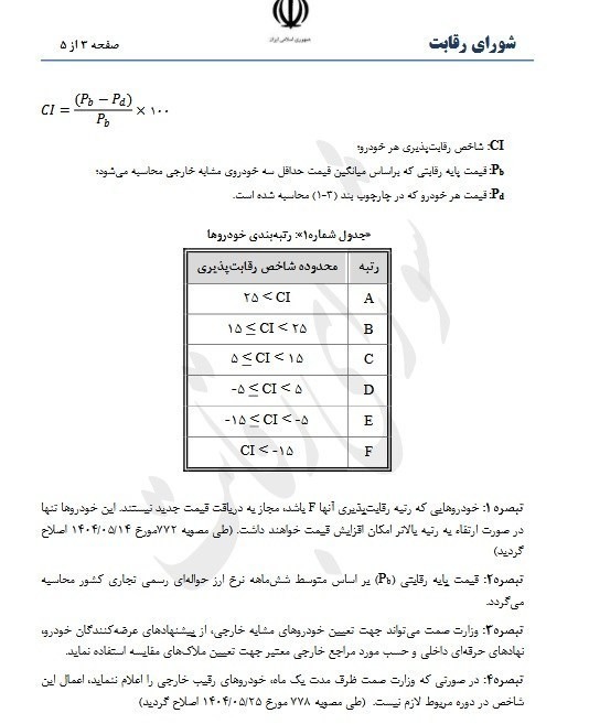 ۲-۳ با هدف نهادینه سازی فضای رقابتی برای هر یک از خودروهای مشمول این دستور العمل بر اساس ترازیابی (Benchmarking) با قیمت حداقل سه خودروی رقیب مشابه خارجی هم رده از نظر کلاس کیفیت و استاندارد؛ شاخصی با عنوان شاخص رقابت پذیری (CI) مطابق فرمول زیر قبل از اعمال قیمت های جدید محاسبه می گردد. وزارت صمت موظف است خودروهای رقیب خارجی را برای هر یک از خودروهای مشمول این دستور العمل مشخص نموده و به همراه قیمت ارزی آنها به سازمان حمایت اعلام نماید سازمان حمایت قیمت رقابتی (P) و شاخص رقابت پذیری را محاسبه و رتبه رقابت پذیری هر خودرو را مطابق جدول شماره ۱» مشخص مینماید و این رتبه را در بررسی قیمتهای اعلام شده توسط عرضه کنندگان خودرو موضوع بند (۱۳) این دستور العمل) لحاظ نماید. برچسب رقابت پذیری هر خودرو که بیانگر رتبه رقابت پذیری آن است توسط سازمان حمایت اعلام می شود و عرضه کنندگان خودرو موظفند اطلاعات مربوط به رتبه و برچسب رقابت پذیری هر یک از انواع محصولات خود را به صورت شفاف به اطلاع کلیه مشتریان برسانند. طی مصوبه ۷۷۸ مورخ ۱۴۰۴/۰۵/۲۵ اصلاح گردید.