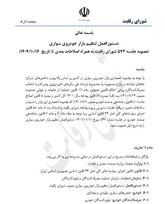 با توجه به وضعیت انحصاری بازار خودروی سواری در کشور بر اساس بالا بودن شاخصهای تمرکز تقاضای انباشته در بازار ممنوعیت یا محدودیت واردات طی سالهای اخیر پایین بودن قدرت انتخاب صرف کنندگان برخی احکام قانونی همچون ماده ۱۲ قانون حمایت از خانواده و جوانی جمعیت مصوب ۱۴۰۰/۷/۲۴؛ بند (ف) تبصره (۷) قانون بودجه سال ۱۴۰۱ کل کشور و تبصره ۵ قانون اصلاحماده (۱۰) قانون ساماندهی صنعت خودرو مصوب ۱۴۰۱/۹/۹ که وضعیت انحصاری این بازار را شدیدتر ساخته اند ضمن دریافت نظرات مشورتی و پیشنهادها شورای رقابت به استناد بند ۵ ماده ۵۸ قانون اجرای سیاستهای کلی اصل ۴۴ قانون اساسی و با توجه به مفاد ماده ۲ و ماده ۷ قانون ساماندهی صنعت خودرو در جلسه شماره ۵۴۳ مورخ ۱۴۰۱/۱۱/۱۱ دستورالعمل تنظیم بازار خودروی سواری را به شرح ذیل تصویب نمود.