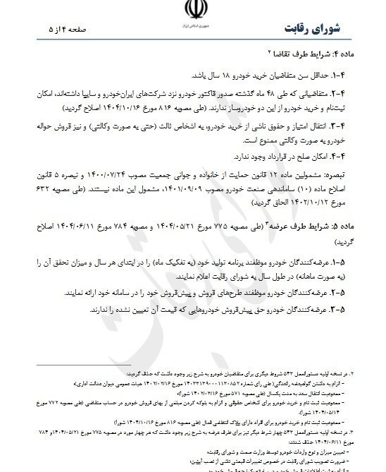۲-۴ متقاضیانی که طی ۴۸ ماه گذشته صدور فاکتور خودرو نزد شرکتهای ایران خودرو و سایپا داشته اند امکان ثبت نام و خرید خودرو از این دو خودروساز ندارند طی مصوبه ۸۱۶ مورخ ۱۴۰۴/۱۰/۱۶ اصلاح گردید.