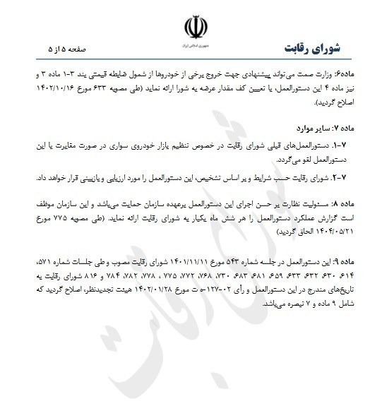 طی مصوبه ۷۳۰ مورخ ۱۴۰۳/۱۲/۲۱ اصلاح گردید. تبصره خودروهای سواری برقی از شمول این دستور العمل مستثنی میشوند طی مصوبه ۶۵۹ مورخ ۱۴۰۳/۰۲/۲۲ و مصوبه ۶۸۳ مورخ ۱۴۰۳/۰۶/۲۷ الحاق گردید.