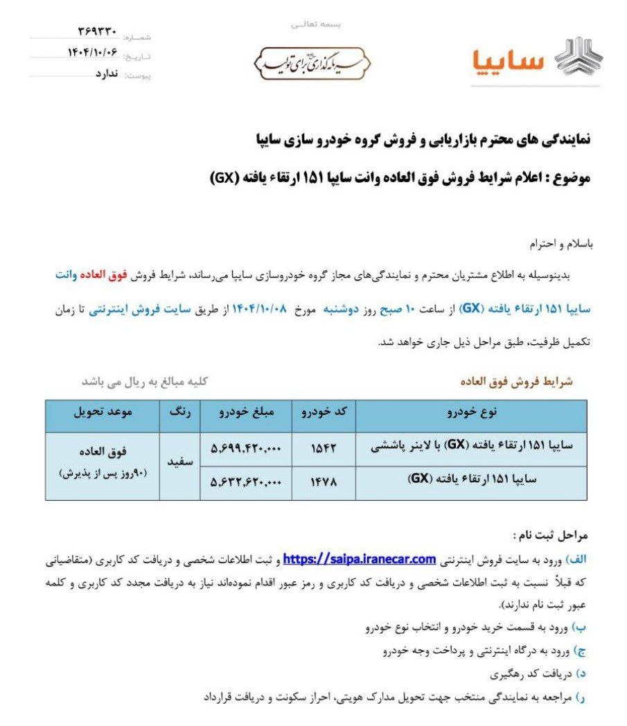 متقاضیان می تواند از ساعت 10 روز دوشنبه 8 دی ماه تا زمان تکمیل ضرفیت در سایت فروش سایپا نسبت به ثبت نام اقدام نمایند.