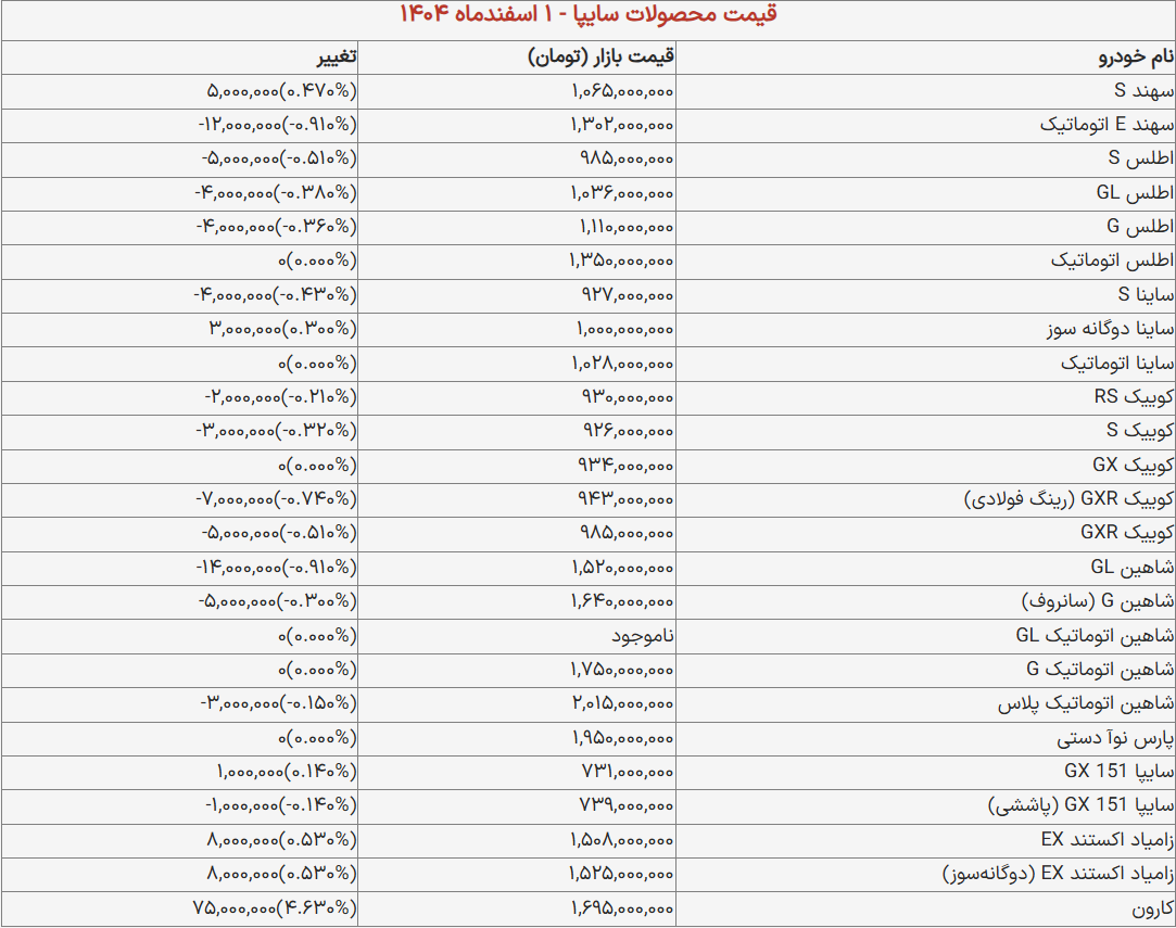 قیمت محصولات سایپا امروز جمعه ۱ اسفندماه ۱۴۰۴