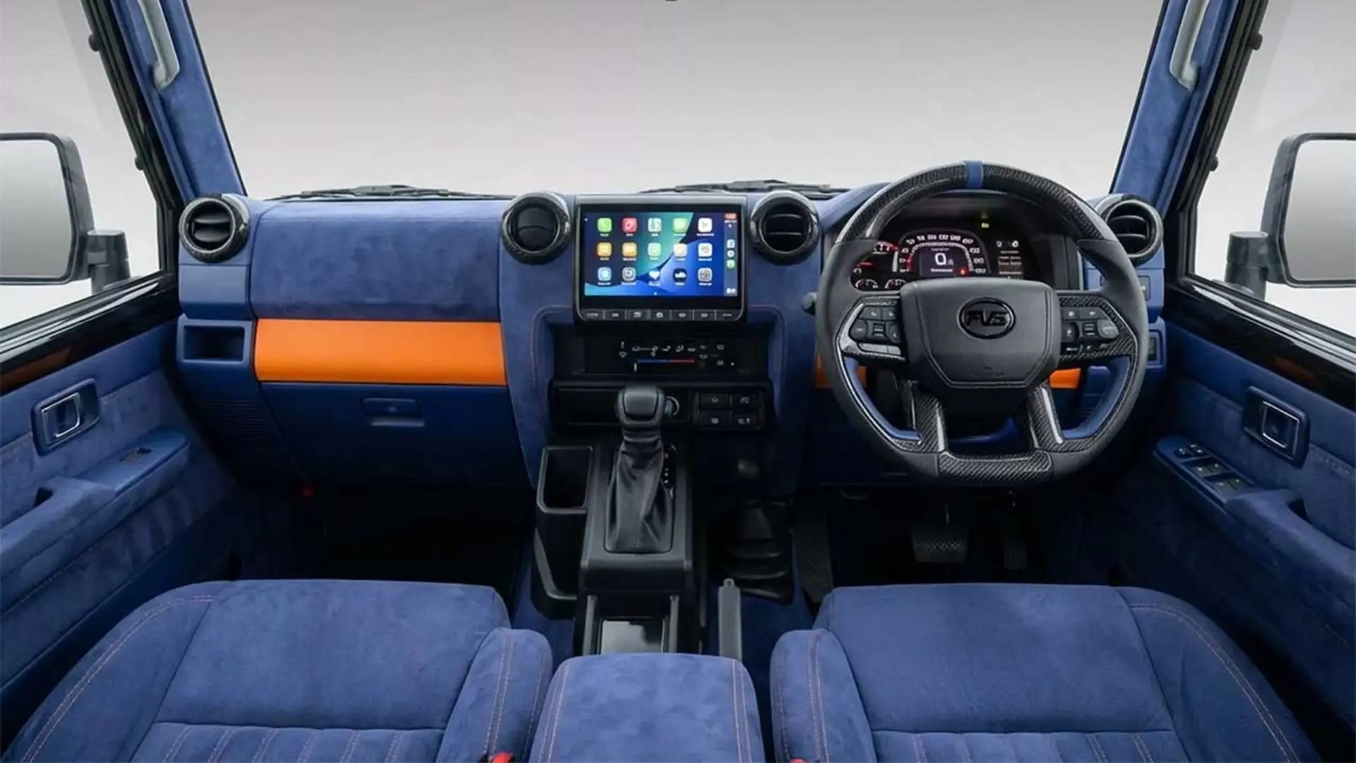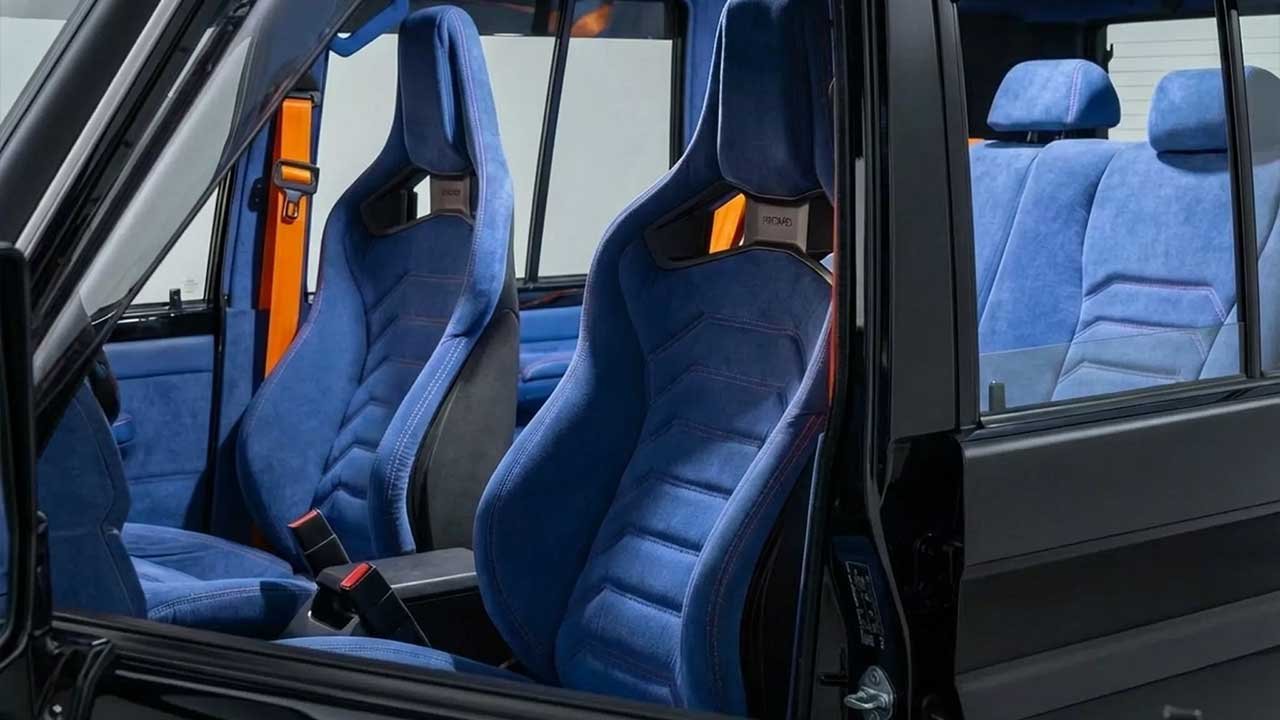 بیشترین تحول را در کابین لندکروزر میبینیم؛ جاییکه فضای ساده و کاربردی جای خود را به طراحی مفهومی داده است. پوشش آلکانترای آبی تیره، صندلیهای مسابقهای ریکارو، فرمان برگرفته از تویوتا تاندرا و نمایشگر ۹ اینچی، کابینی کاملاً متفاوت و غیرمنتظره برای لندکروزر ساختهاند.