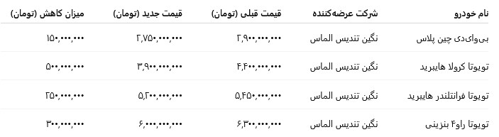 بر این اساس، قیمت جدید خودروهای عرضهشده توسط نگین تندیس الماس به شرح زیر اعلام شده است: