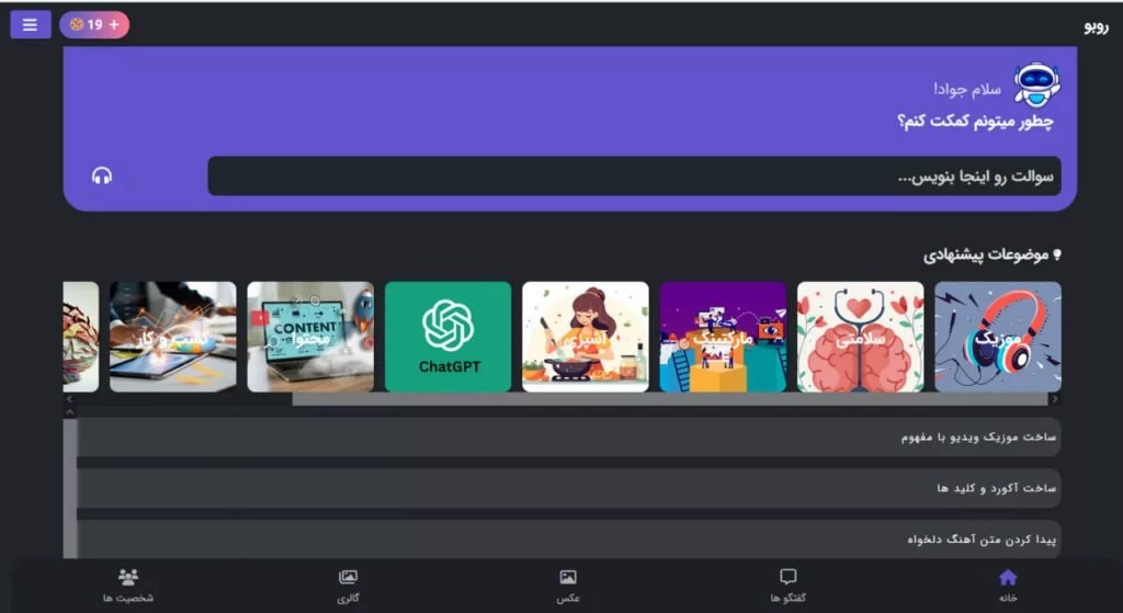 روبو چتبات هوش مصنوعی ایرانی دیگری است که مانند ChatGPT عمل میکند و از طریق دستورات متنی شما میتواند کارهای زیادی انجام دهد. همچنین این ابزار به ویژگی با نام روبو پیکاسو مجهز است که ایدههای شما را به تصویر تبدیل میکند.