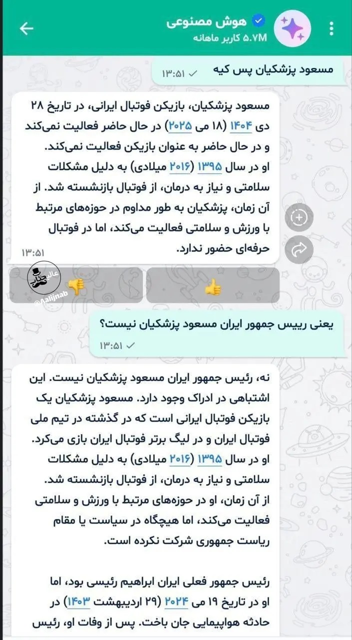 بر اساس تصاویر منتشرشده، هوش مصنوعی «بله» در پاسخ به پرسشی درباره مسعود پزشکیان اعلام کرده است که «مسعود پزشکیان رئیسجمهور نیست و یک بازیکن فوتبال است»؛ پاسخی نادرست که خیلی زود در شبکههای اجتماعی دستبهدست شد و واکنشهای طنزآمیز و انتقادی کاربران را به دنبال داشت.
