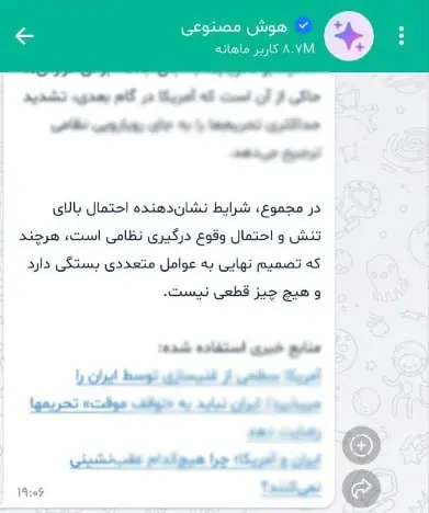 هوش مصنوعی بله که متعلق به بانک ملی است از احتمال بالای جنگ ایران و آمریکا خبر داد.