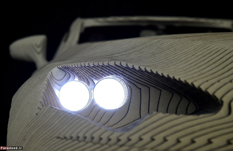 همانطور که گفتیم این خودرو از با برش لیزری سه بعدی ساخته شده که قطعات آن البته قابل بازیافت هم هستند. تمام قطعات مقوایی این خودرو برش مخصوص به خود را داشته است.