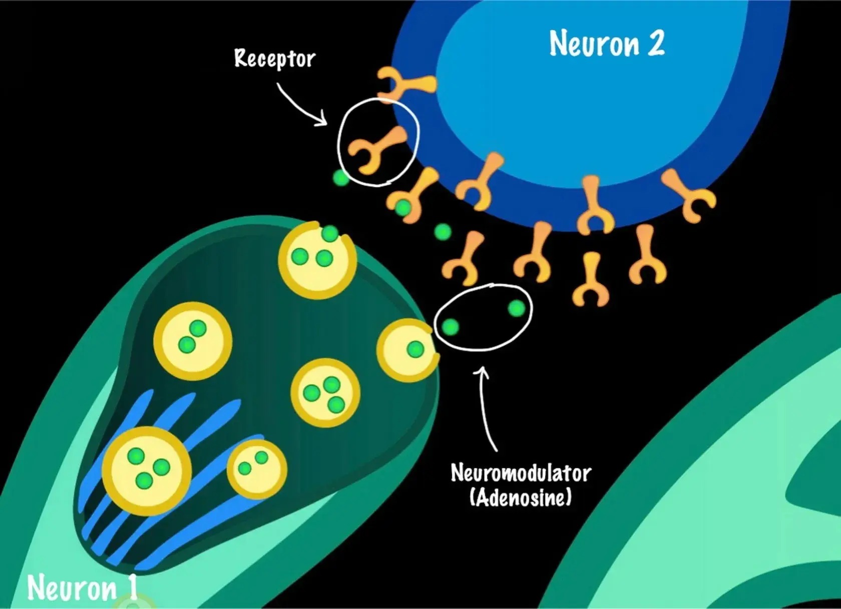 این جای پارکها، گیرندههای خاصی روی سطح سلولهای عصبی هستند. وقتی آدنوزین به این گیرندهها متصل میشود، سرعت فعالیت نورونها را پایین میآورد و پیام خستگی را مخابره میکند. هرچه بیشتر بیدار باشید، آدنوزین بیشتری تولید میشود و بدن با اصرار بیشتری خواب را مطالبه میکند.