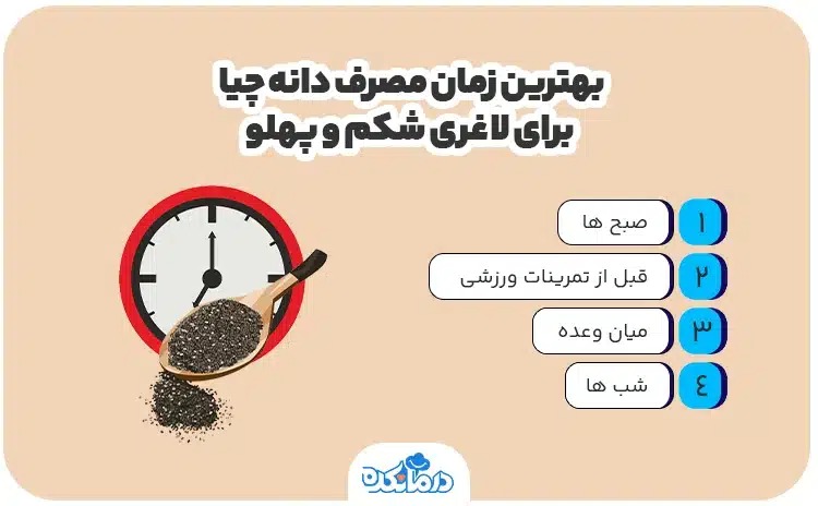 برای کاهش وزن و لاغری دور شکم میتوانید دانه چیا را در برنامه غذایی روزانه خود بگنجانید و در ساعات مختلفی از روز میل کنید. در ادامه به لیستی از بهترین زمانها برای مصرف دانه چیا اشاره شده است.