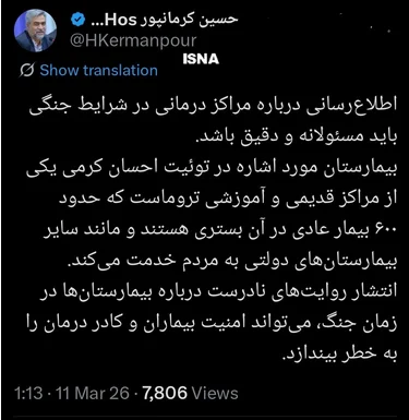 مسئول روابطعمومی وزارت بهداشت در شبکه اجتماعی ایکس نوشت: اطلاع رسانی درباره مراکز درمانی در شرایط جنگی باید مسئولانه و دقیق باشد.