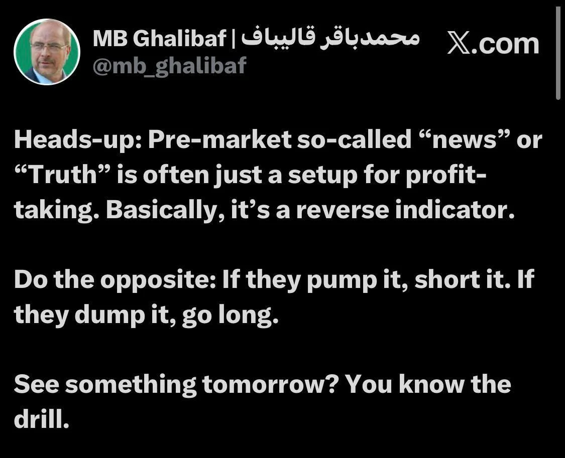 «ما در مرحلهای از جنگ هستیم که رئیس مجلس ایران در حال ارائه توصیههای معاملاتی است. سورئال (چیزی فراتر از واقعیت)»