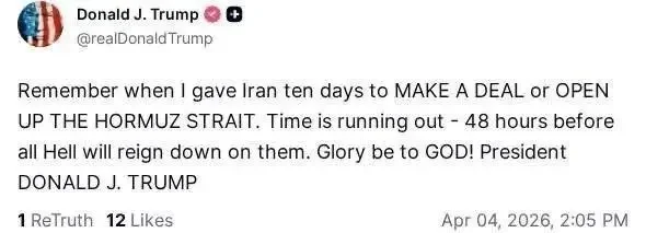 دونالد ترامپ در Truth Social مدعی شد: «یادتان هست که به ایران ده روز دادم تا به توافق برسد یا تنگه هرمز را باز کند؟ زمان در حال اتمام است - ۴۸ ساعت باقی مانده تا تمام جهنم بر سرشان فرود آید»