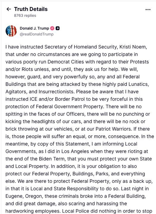 رئیس جمهور آمریکا در این خصوص اعلام کرد: من به کریستی نوئم وزیر امنیت داخلی آمریکا دستور دادم تا تحت هیچ شرایطی در اعتراضات و/ یا شورش های شهرهای مختلف دموکرات که به طور ضعیفی اداره می شوند، حضور نخواهیم یافت؛ مگر اینکه و تا زمانی که آنها از ما درخواست کمک کنند.