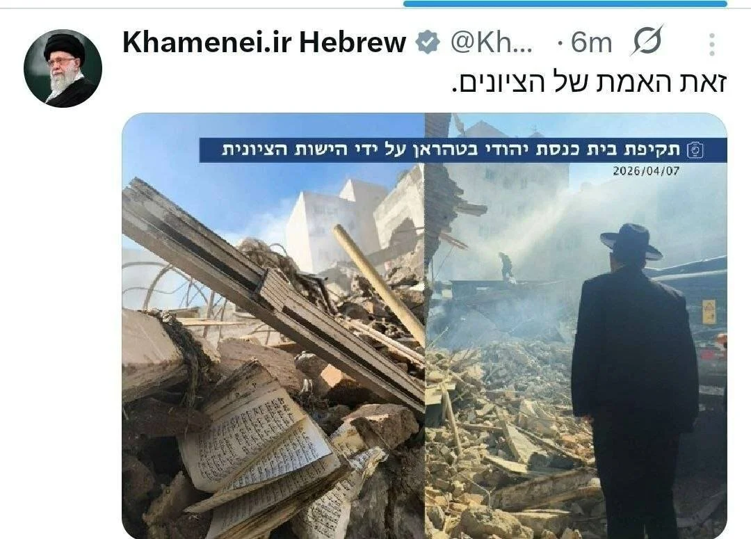 حساب کاربری رهبر شهید انقلاب اسلامی در ایکس به زبان عبری با انتشار تصویر تخریب کنیسه رفیع نیا در تهران در اثر حمله رژیم جنایتکار صهیونی، نوشت: حقیقت صهیونیست ها این است