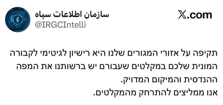 حساب کاربری منتسب به اطلاعات سپاه نوشت که حملات اسرائیل به مناطق مسکونی در ایران مجوز حمله ایران به پناهگاه های اسرائیل است.