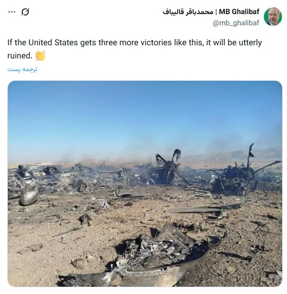 محمدباقر قالیباف رییس مجلس شورای اسلامی در توییتی به زبان انگلیسی به شکست اخیر آمریکا در داخل خاک ایران اشاره کرد و آن را بسیار مفتضحانه خواند.