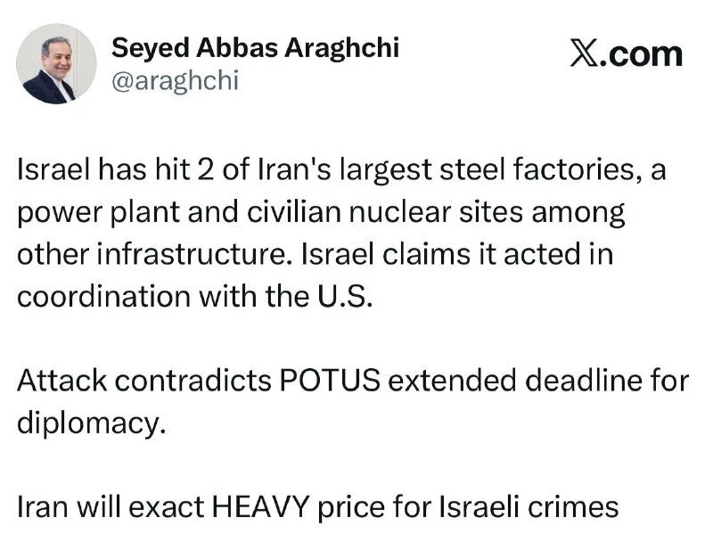 سید عباس عراقچی وزیر امور خارجه در واکنش به هدف قرار گرفتن زیرساخت های کشورمان در شبکه ایکس نوشت: «اسرائیل دو مورد از بزرگترین کارخانههای فولاد ایران، یک نیروگاه برق و همچنین سایتهای هستهای غیرنظامی را در کنار سایر زیرساختها هدف قرار داده است. اسرائیل مدعی است که این اقدام را با هماهنگی ایالات متحده انجام داده است.