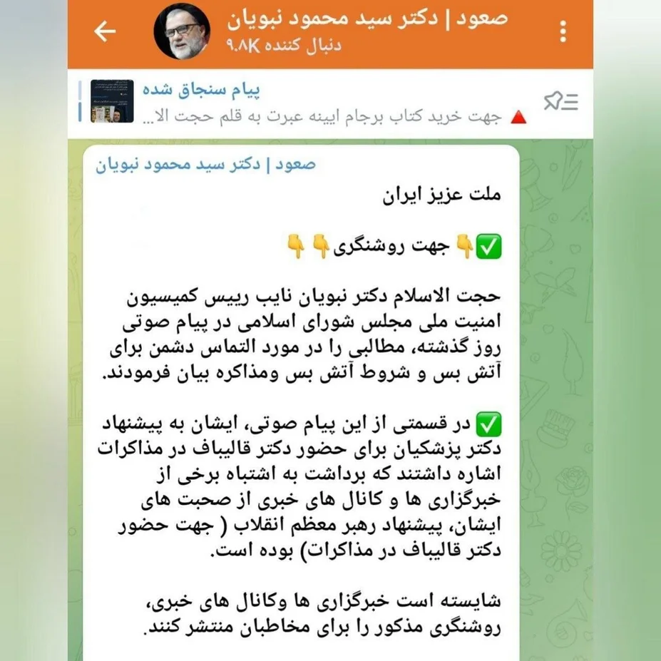 در قسمتی از این پیام صوتی او به پیشنهاد پزشکیان برای حضور قالیباف در مذاکرات اشاره داشت که برداشت به اشتباه برخی از خبرگزاری ها و کانال های خبری از صحبت های او، پیشنهاد رهبر انقلاب( جهت حضور قالیباف در مذاکرات) بوده است.