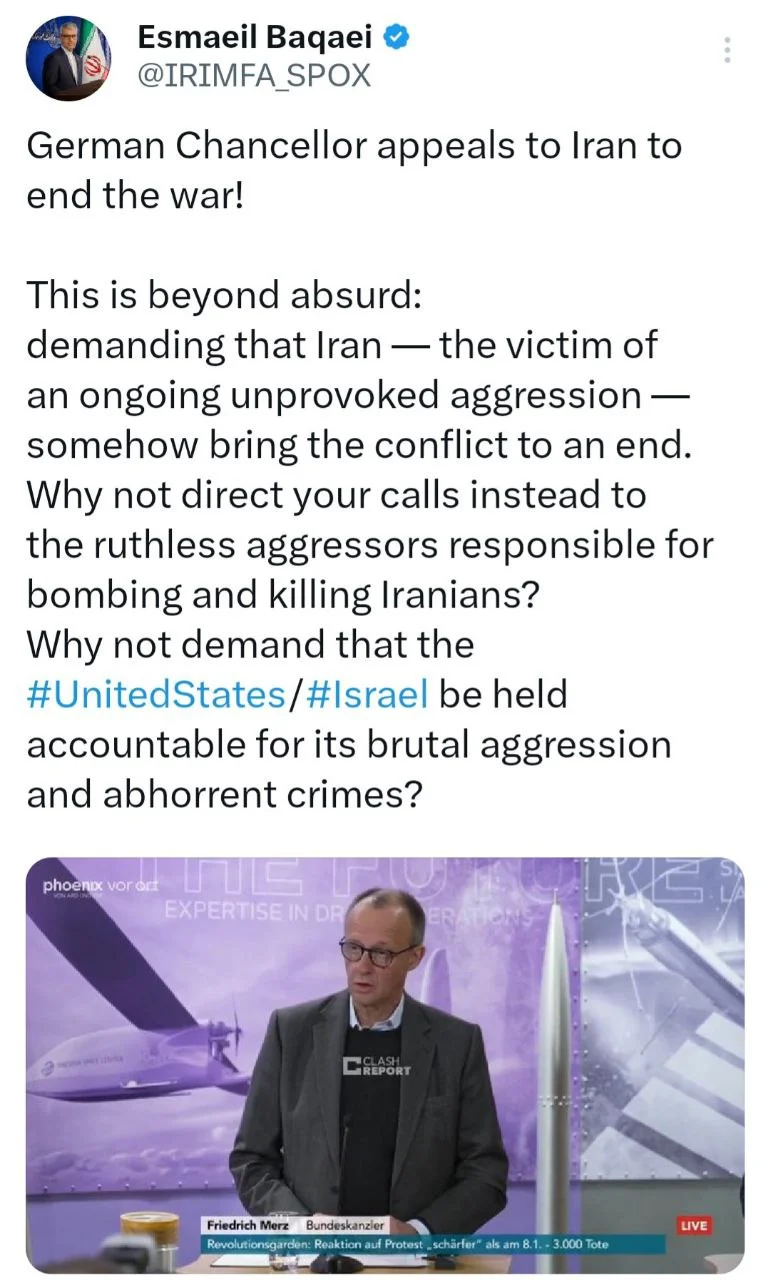 سخنگوی وزارت امور خارجه ضمن پاسخ به درخواست صدراعظم آلمان از ایران برای پایان دادن به جنگ، این سوال را از وی مطرح کرد که چرا نمیخواهید که آمریکا و رژیم صهیونیستی به خاطر این تهاجم وحشیانه و جنایات نفرتانگیزشان پاسخگو باشند و مورد بازخواست قرار گیرند؟