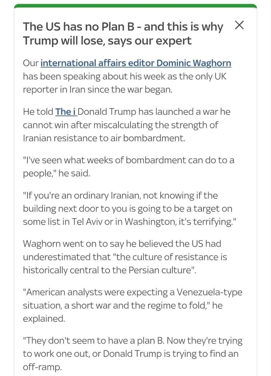سردبیر بینالملل شبکهٔ اسکاینیوز گفت: ترامپ وارد جنگی شده است که راهی برای پیروزی در آن ندارد؛ چراکه در محاسبه میزان مقاومت ایرانیها در برابر بمبارانهای هوایی، دچار اشتباهی استراتژیک شده است.