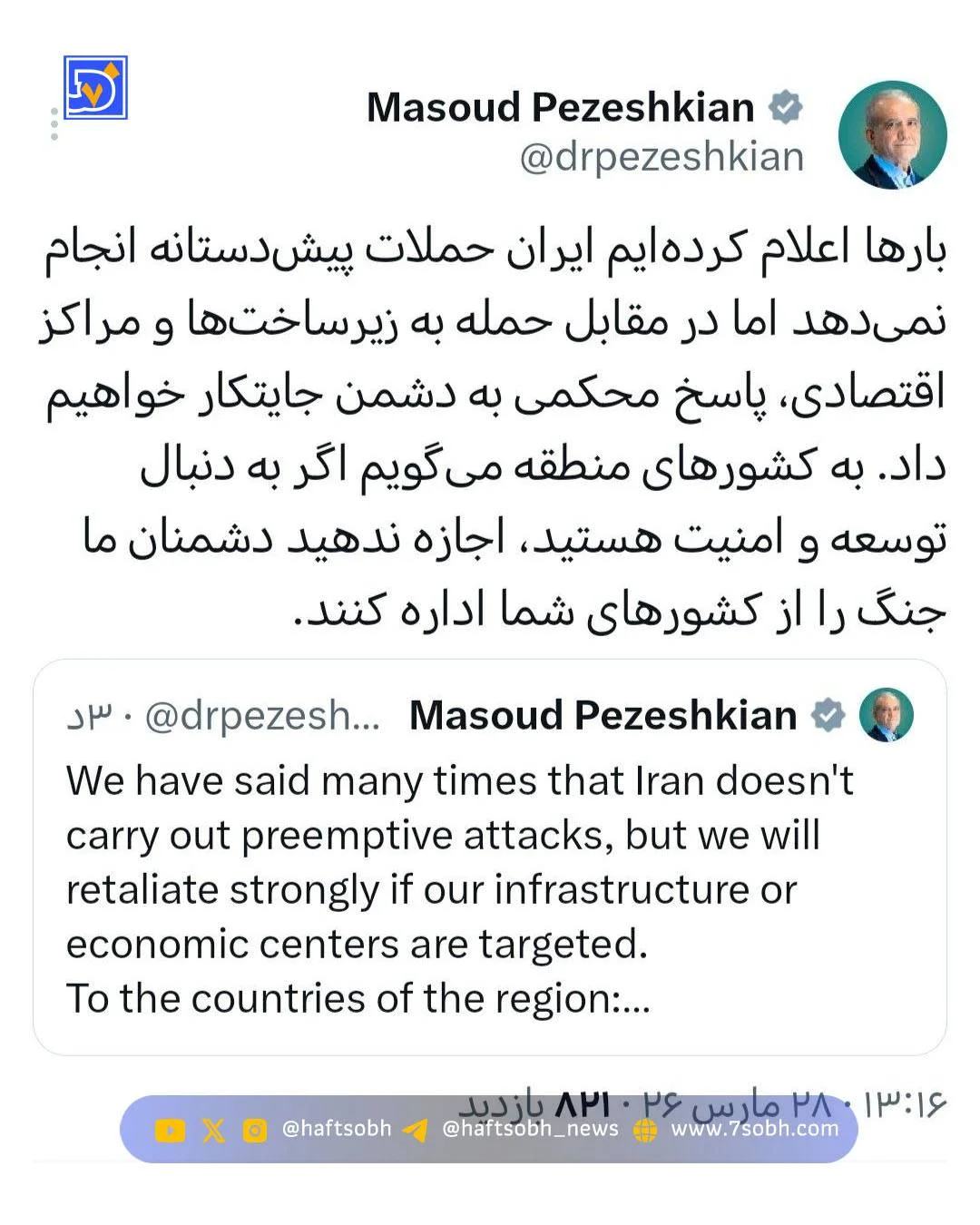 پزشکیان ضمن ابراز تاسف از استفاده متجاوزان از قلمرو برخی کشورهای مسلمان در حمله علیه ایران تاکید کرد: واکنش دفاعی ایران به مبدا این حملات طبیعی است، در حالیکه جمهوری اسلامی ایران کشورهای مسلمان را برادر خود میداند و نمیخواهد حتی یک مسلمان آسیب ببیند.