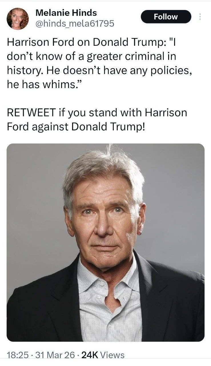 هریسون فورد بازیگر آمریکایی: جنایتکاری بزرگتر از ترامپ در تاریخ نمیشناسم