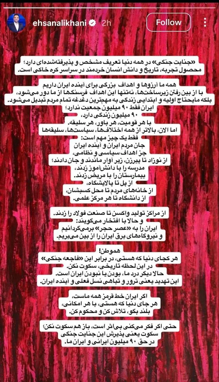 احسان علیخانی در پاسخ به یاوههای اخیر ترامپ و تجاوز به خاک ایران مطلب زیر را منتشر کرد: