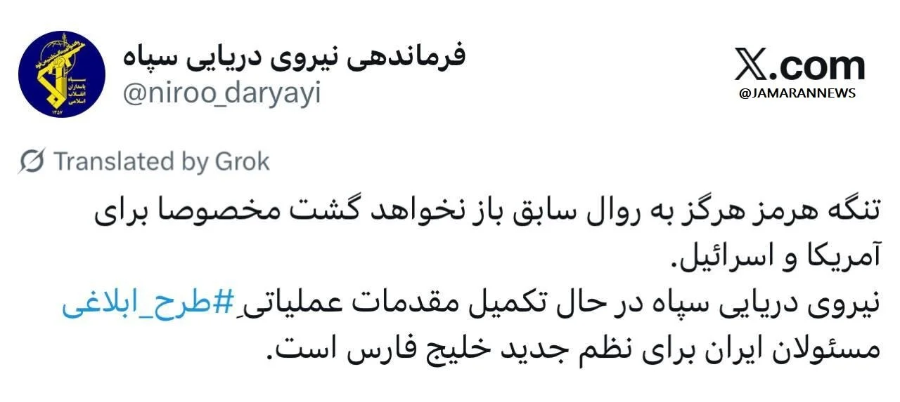 فرماندهی نیروی دریایی سپاه نوشت: تنگه هرمز هرگز به روال سابق بازنخواهد گشت مخصوصا برای آمریکا و اسرائیل.