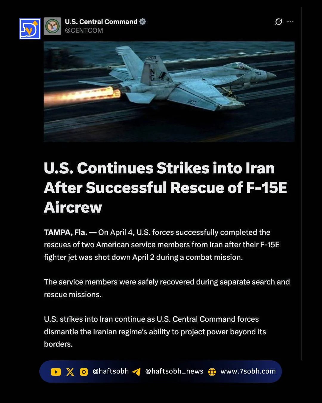 آکسیوس، به نقل از ۳ مقام آمریکایی: نیروهای ویژه آمریکایی دومین خدمه جت جنگنده اف-۱۵ سرنگون شده بر فراز ایران را نجات دادند.