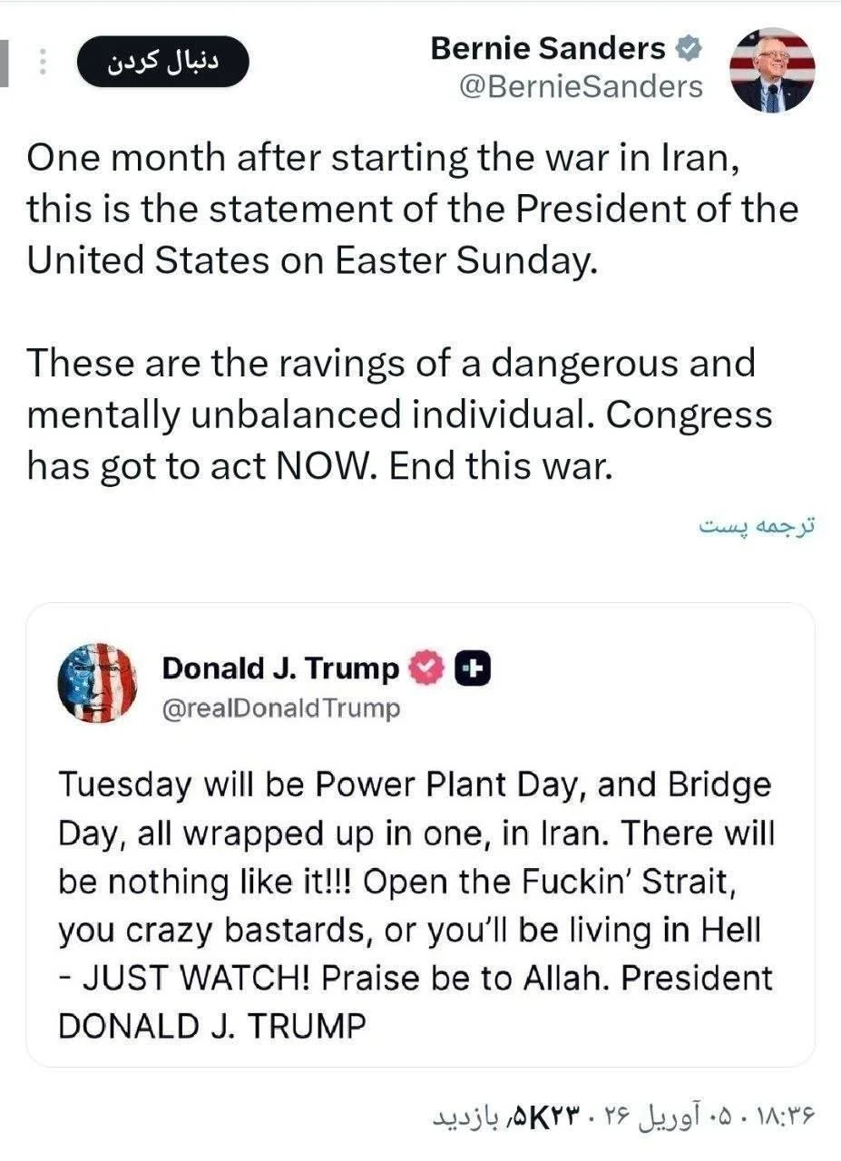 این سناتور آمریکایی تصریح کرد: اینها هذیانهای یک فرد خطرناک و از نظر روانی نامتعادل است. کنگره باید همین حالا اقدام کند. این جنگ را پایان دهید.