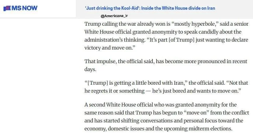 شبکه MS Now آمریکا: ترامپ از جنگ با ایران خسته شده است