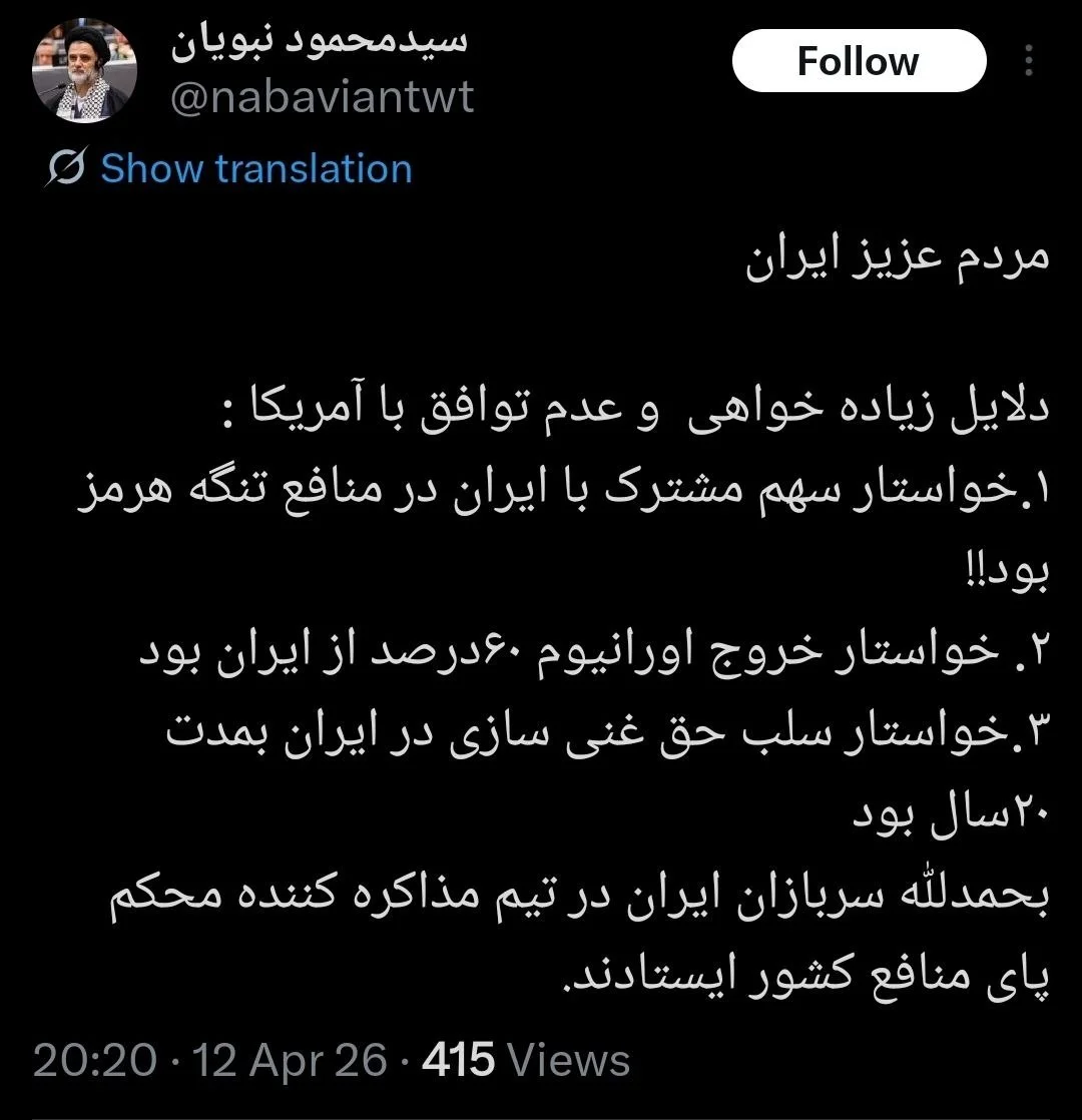 اکانت منتسب به آقای سیدمحمود نبویان، نماینده مجلس و عضو هیات کارشناسی مذاکرهکننده در اسلامآباد پاکستان نوشت: