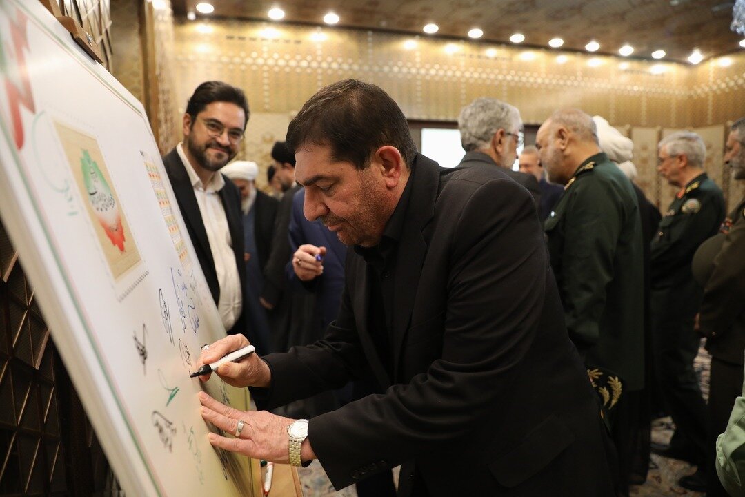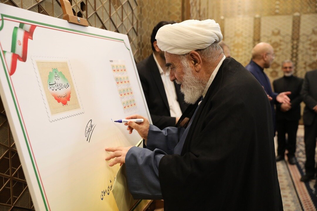 تصویری از مدیر قوه مجریه و رئیس دفتر مقام معظم رهبری در حال امضای تمبر یادگاری