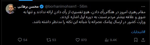 محسن برهانی، حقوقدان در شبکه اجتماعی ایکس نوشت: «مقام رهبری امروز در هنگام رأی دادن، هیچ تفسیری از رأی دادن ارائه ندادند و تنها به شوق و علاقه بیشتر مردم نسبت به دوره اول اشاره کردند. وزارت کشور در ارسال پیامک عصرانه یا شبانه این نکته را مدنظر داشته باشد.»