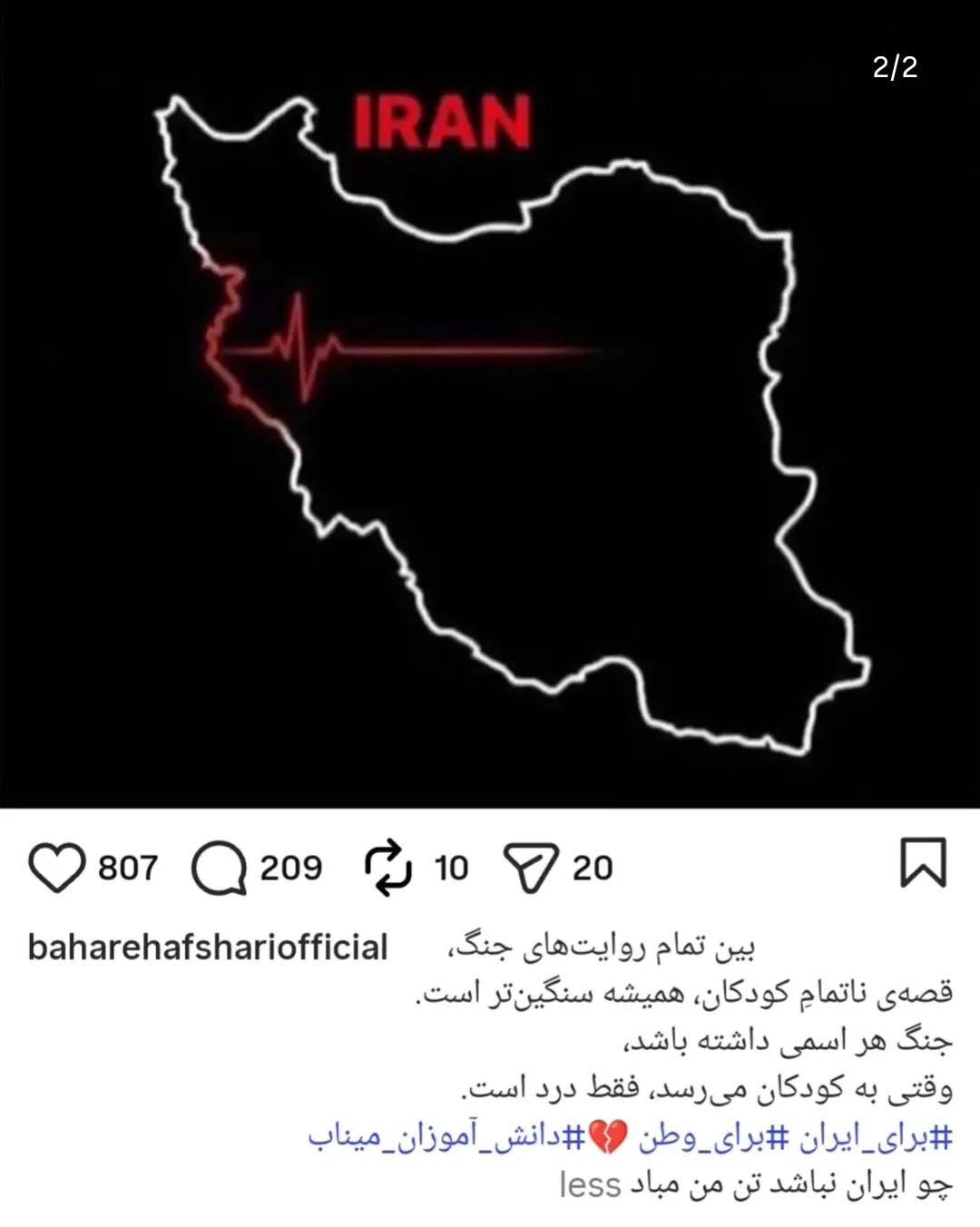 کاش نمانم اما تو بمانی ایران زیبای من؛ آشا محرابی بازیگر، در پی حمله دشمن آمریکایی-صهیونیستی به خاک ایران، با انتشار یادداشتی در اینستاگرامش نوشت: «ایران من، وای که خون گرم فرزندانت، بر خاک زیبایت جاری شد. با دلی که هر روز بیشتر فرومیریزد، درد تو و مردم دلیرت استخوانم را میشکافد. ایران و ایرانی را به خدا میسپارم. بمانید. کاش نمانم اما تو بمانی ایران زیبای من، ما اما میمانیم. با نیروی عشق، با مردم عاشقت، مردمی که عاشقند به تو و به یکدیگر.»