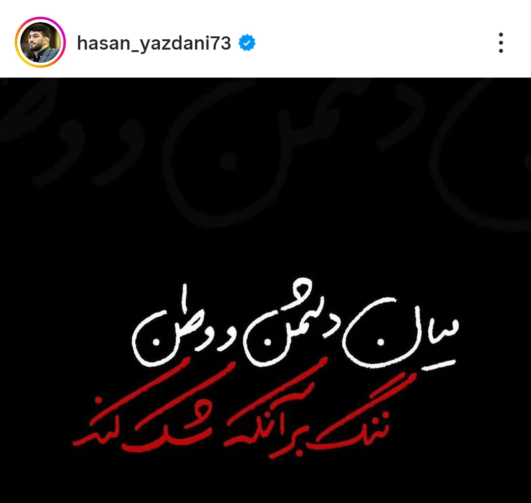 قهرمان دوستداشتنی کشتی جهان و المپیک با انتشار پستی با مضمون «میان دشمن و وطن ننگ بر آنکه شک کند» به اتفاقا اخیر واکنش نشان داده. یزدانی نوروز را با یاد و نام تمام عزیزان از دست رفته تبریک گفته و نوشته سرباز شما بودن برای من از هر مدال المپیک با ارزشتر است.