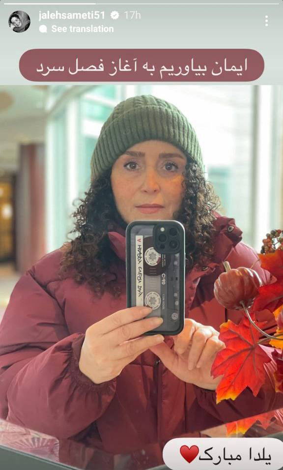 سلفی ژاله صامتی در شب یلدا با لباسی به رنگهای سبز و قرمز که حال و هوای یلدایی داشت باعث جلب توجه کاربران در فضای مجازی شد.