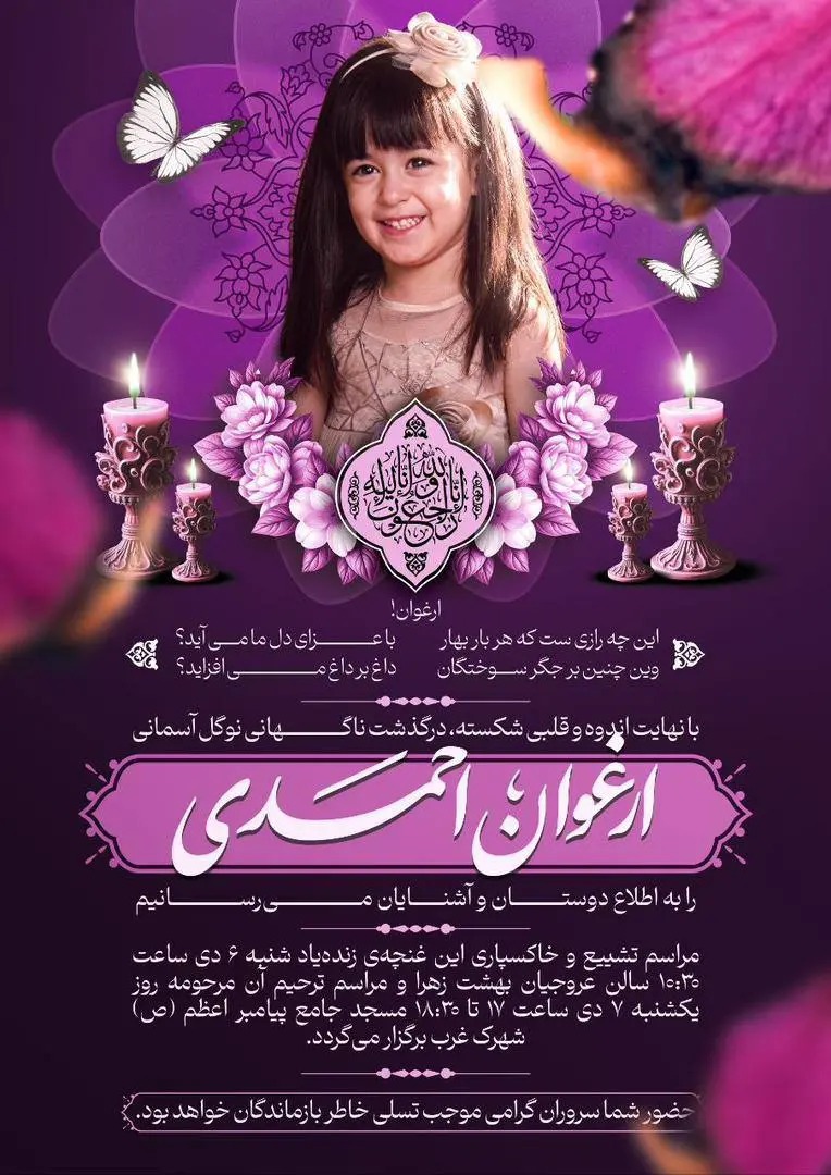 به گزارش هفت صبح درگذشت ناگهانی ارغوان احمدی، دختر خردسال محمدرضا احمدی مجری مطرح صداوسیما، به دلیل ابتلا به آنفولانزا و درگیری ریه باعث موجی از تأثر و واکنشها در فضای رسانهای شد.