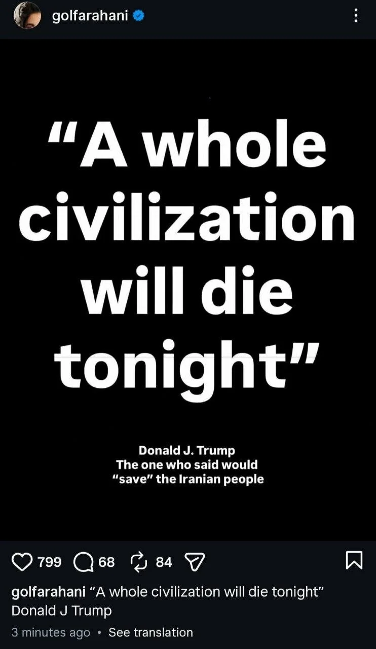 گلشیفته فراهانی به تهدید ترامپ علیه ایران در واکنشی کنایهآمیز نوشت: ترامپ گفت امشب یک تمدن کامل خواهد مرد. همان کسی که گفت مردم ایران را «نجات» میدهد.