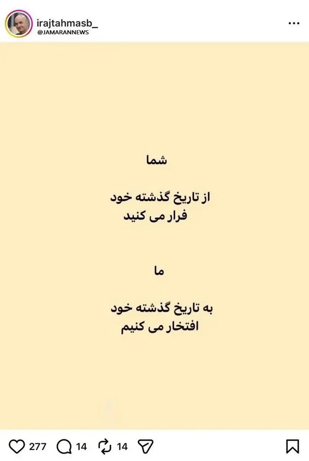 ایرج طهماسب به تهدید ترامپ واکنش نشان داد و نوشت: ما به تاریخ گذشته خود افتخار میکنیم
