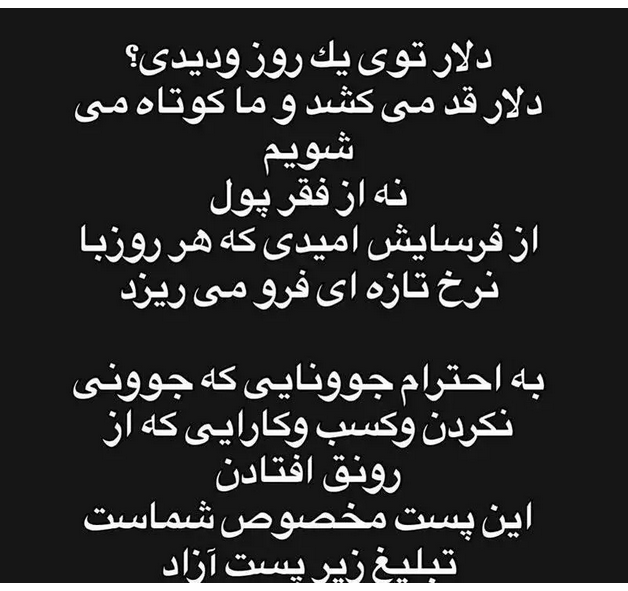 مریم مومن و مهسا حجازی به تازگی با انتشار مطلبی در صفحه اینستاگرام شخصی خود واکنش تازهای نسبت به افزایش قیمت دلار نشان داده است.