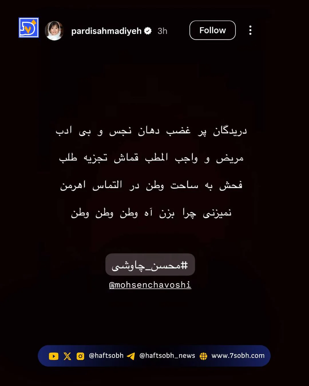 پردیس احمدیه، بازیگر سینما و تلویزیون: دریدگان پر غضب دهان نجس و بی ادب مریض و واجب المطب قماش تجزیه طلب فحش به ساحت وطن در التماس اهرمن