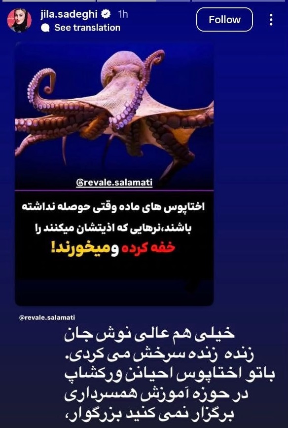 ژیلا صادقی، مجری پرحاشیه صداوسیما، با بازنشر یک مطلب علمی در صفحه اینستاگرامش بار دیگر خبرساز شد. این مطلب درباره رفتار اختاپوسهای ماده بود که طبق آن، در شرایطی خاص و زمانی که حوصله ندارند، نرهایی را که آنها را آزار میدهند خفه کرده و میخورند.