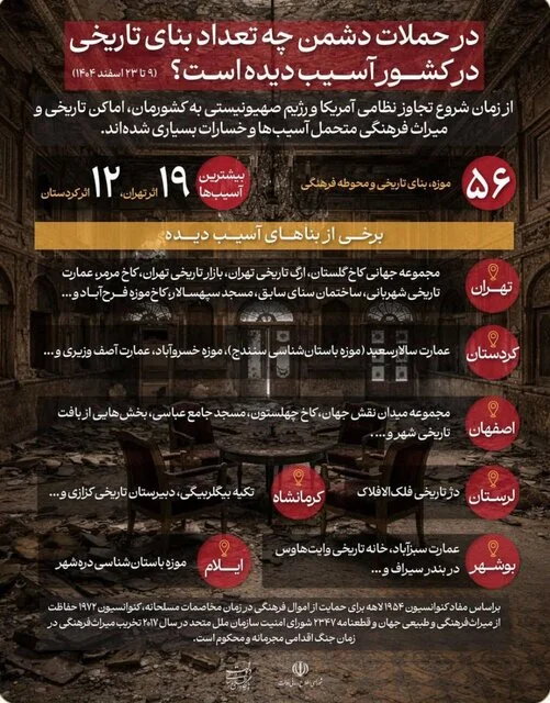 مجموعه جهانی کاخ گلستان، ارگ تاریخی تهران، بازار، کاخ مرمر، عمارت شهربانی، ساختمان سنای سابق، مسجد سپهسالار، کاخ فرحآباد از جمله آثاری هستند که بر اثر حملات هوایی آمریکا و اسرائیل به تهران آسیب و خسارت دیدهاند.