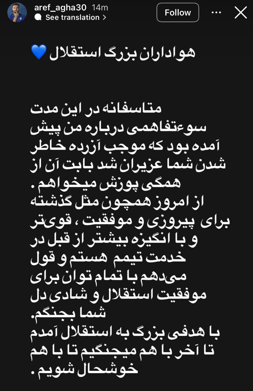 به گزارش هفت صبح ورزشی، عارف آقاسی پس از شایعات فراوان و درگیری با هواداران و سرمربی استقلال، از هوادران عذرخواهی کرده و اعلام کرده که در استقلال میماند.