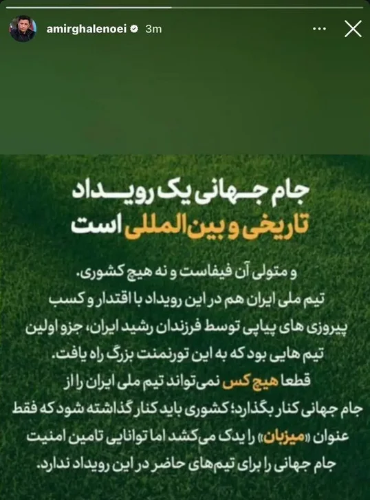 امیر قلعهنویی سرمربی تیم ملی در واکنش به صحبتهای ترامپ یک استوری منتشر کرد.