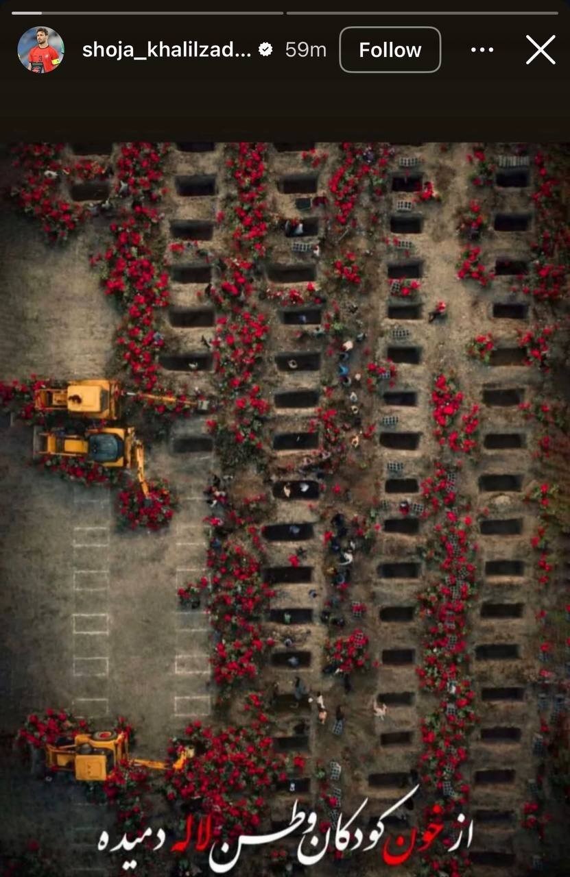 در تصویری که خلیلزاده منتشر کرده، نمایی هوایی از محل دفن قربانیان این حادثه دیده میشود؛ جایی که قبرهای متعددی برای شهدای کودک و نوجوان حفر شده و با گلهای سرخ پوشانده شده است.