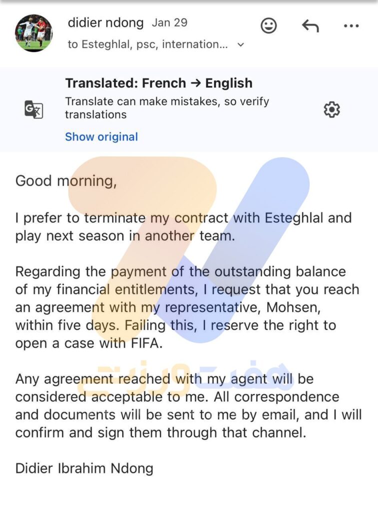 در خصوص پرداخت مانده مطالبات مالیام، از شما درخواست میکنم حداکثر ظرف مدت پنج روز با نمایندهام، محسن، به توافق برسید. در غیر این صورت، حق خود میدانم که پروندهای را نزد فیفا مطرح کنم.